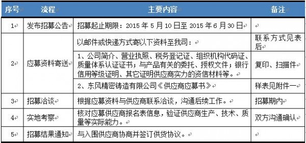 通過(guò)本次招募尋求1-2家滿足條件的覆膜砂模具供應(yīng)商,作為東風(fēng)精鑄制造業(yè)務(wù)鏈的有效組成部分。