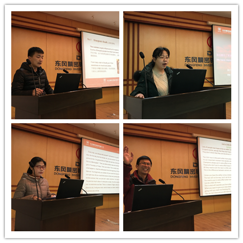 為強化學習效果并學以致用,公司組織英語競賽,分為理論測試與口語演講兩個部分。演講比賽中,聘請汽院專業英語老師為評委,通過個人介紹,主題演講與現場互動問答三個方面,經過激烈的對決,史云、謝勤杰、劉悅三位同志位列前三甲。競賽最后綜合成績待理論考試成績出來后再確定。